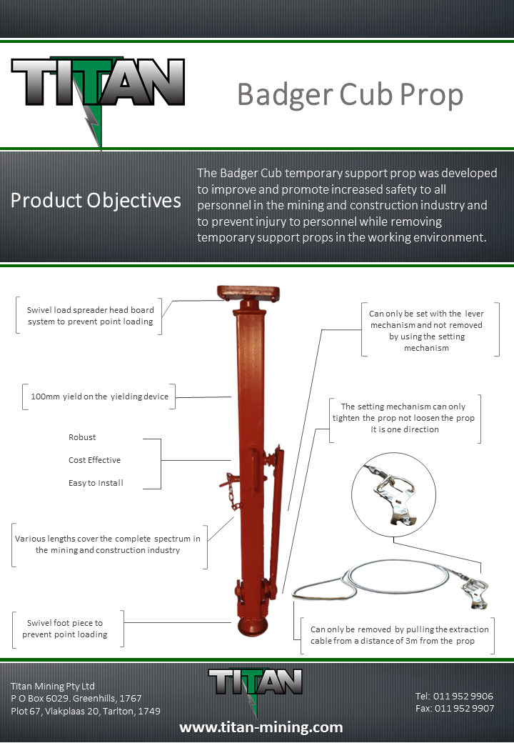 Titan Mining has designed and patented a temporary support prop with a design feature that is unique to the industry. The Badger temporary support can only be released from a safe distance by means of a pull cable. It cannot be released with the tensioning handle. There are two models in various lengths. The one model, the Badger Plus, can yield for a distance of 100mm and the other, the Badger, has no yielding capabilities.